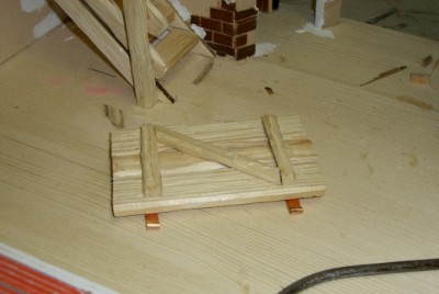 Anschließend werden auf dem Grundriss aus vielen kleinen Teilen zuerst die Außenwände aufgebaut, aufdie dann - wiederum aus vielen Einzelteilen separat zusammengestellt - die Dachkontruktion gesetzt wird. Den Abschluss des Daches bilden dann meist Stück für Stück aufgelegte Dachschindeln.